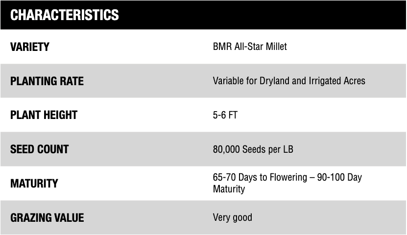 All Star BMR Pearl Millet is a hybrid brachytic dwarf BMR and a summer annual forage grass suited best for grazing or hay. Classified as a tall growing warm season grass, with stems that grow in thick clumps with abundant leaves 1 ½ to 2 inches wide.