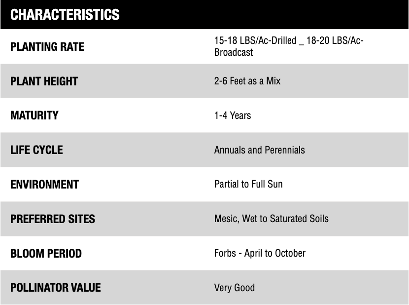 Mixture contains wetland forbs, sedges, rushes and grasses