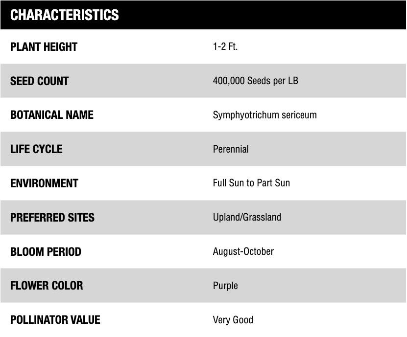 Silky Aster is native to the United States from Texas to North Dakota and west to the Great Lakes. Given its name from the silky hairs that cover its leaves, this perennial will grow to a height of 1-3 feet. Occupying dry, upland sites and open woodlands, it is very drought tolerant preferring to grow in full sun. The purple and yellow flowers are in bloom from August-October when it is frequented by many insects and pollinators.