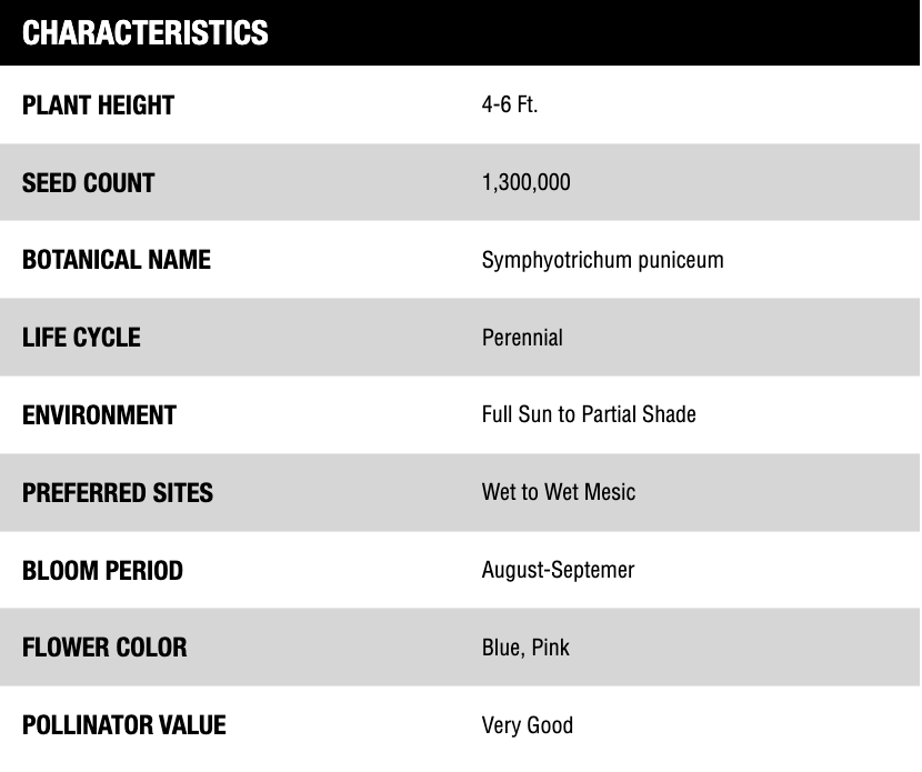 Natively growing north and east of a line from Mississippi to the Dakotas and across most of Canada, swamp aster prefers wet to mesic soils where it can grow from 1-7 feet tall. This perennial is not tolerant of drought or competition and will show signs of stress under these conditions. Blooming from August-September, the blue flowers are frequented by many pollinators and other insects utilize the leaves and stems. This plant is commonly referred to as purple stemmed aster due to the purple coloration of its stem, although this is not a true identifying feature.