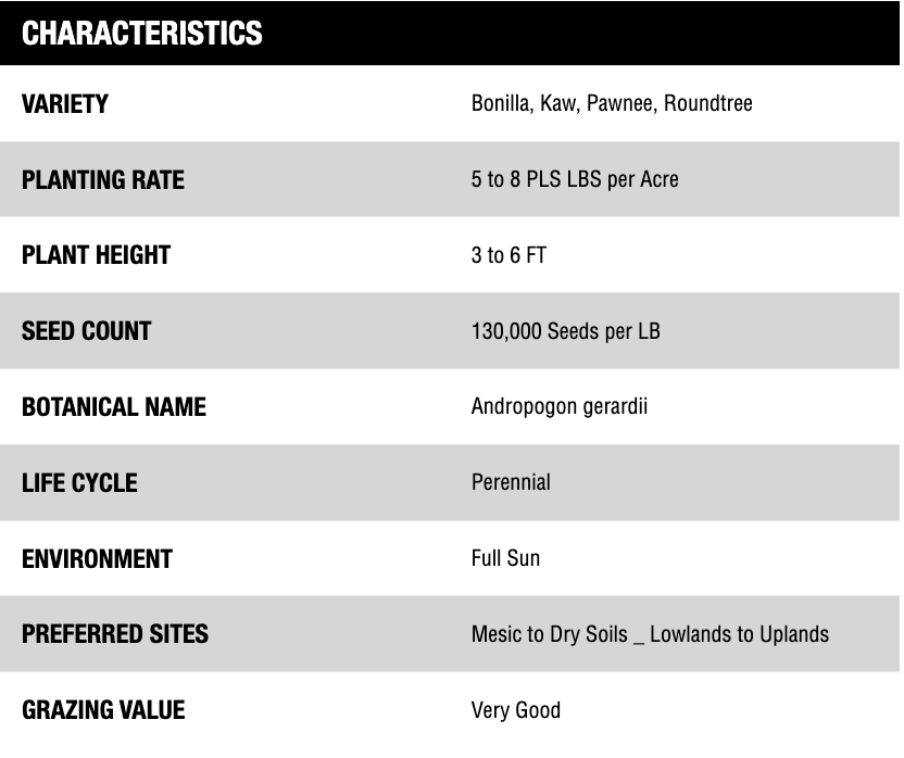 Star Seed offers several improved varieties including Bonilla, Kaw, Pawnee and Roundtree. Each Big Bluestem variety offers adaptability for certain regions of the United States as well as varying qualities for palatability, temperature, moisture and drought tolerances.
