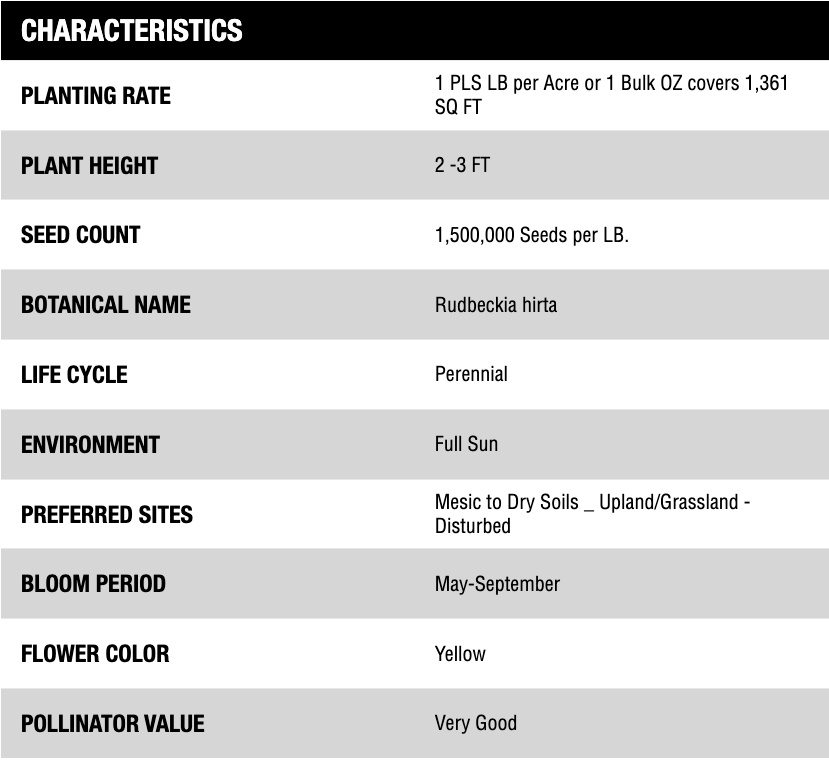 Black Eyed Susan could just be one of the most popular wildflowers with it's wide adaptation distribution across the United States. This biennial wildflower makes a great choice for native prairies, landscaping and food and habitat for wildlife and pollinators.