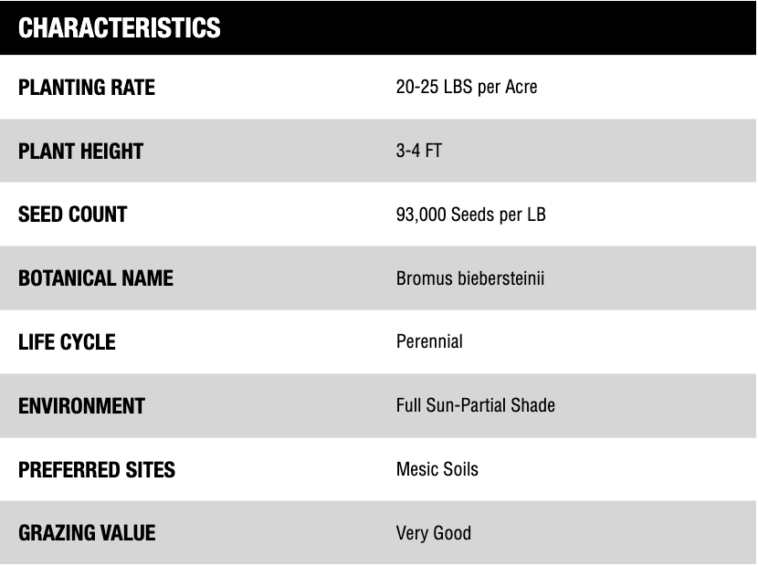 Meadow brome is adapted to the same soils and climatic conditions as smooth brome. Meadow bromegrass can extend the prime grazing season as well as increase total forage production, and is very compatible with alfalfa. It has good drought tolerance and excellent winter hardiness.