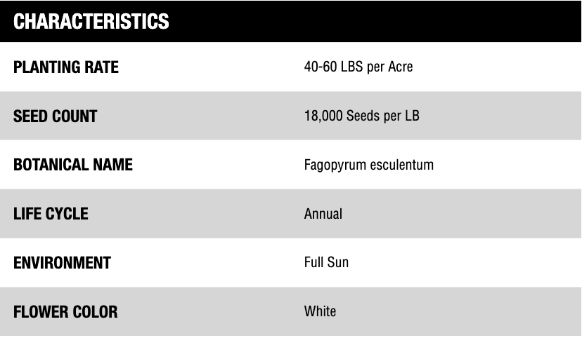 Buckwheat is an annual broadleaf forb that is used to improve soil phosphorus availability, loosen surface soil, and attract beneficial insects. It can produce exceptional yields of nectar and pollen for bees and other pollinators, producing a strong flavored dark honey.