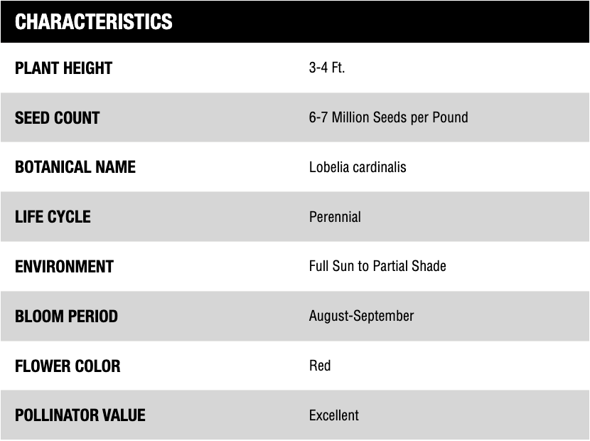 Cardinal flower is distributed across the southern and eastern halves of the United States growing best in wet to mesic soils. A perennial, growing to a height of 4 feet, its bright red flowers can be seen in bloom from August-September.