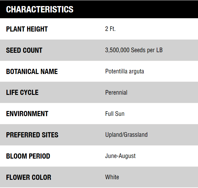 COMMENTS: This rather ordinary-looking plant resembles Potentilla recta (Sulfur Cinquefoil), an introduced plant, in its erect habit and overall appearance. However, Prairie Cinquefoil has white or cream flowers and hairy pinnate leaves, while Sulfur Cinquefoil has light yellow flowers and less hairy palmate leaves. When ultra-blue light is made visible through a special filter, patterns are revealed in the flowers of many cinquefoils that are not apparent to the human eye, but perceptible by most pollinating insects. These ultra-violet reflecting patterns help the flowers stand out from the background, and may function as nectar guides. Thus, the flowers are colored a combination of white and bee-blue.