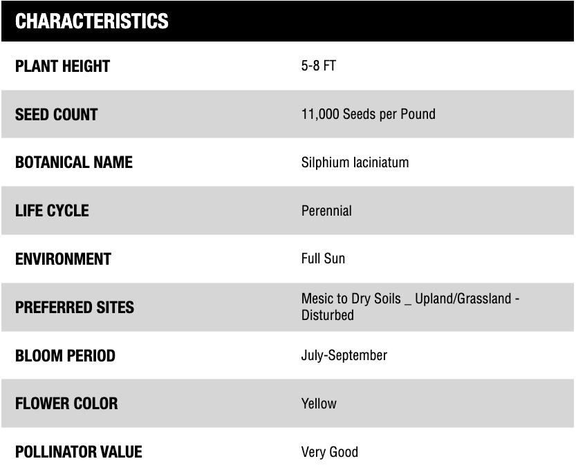 Compass Plant is a long-lived perennial found in much of the Central and Southern Plains, Eastern and Northeastern United States. This wildflower develops a a broad, very deep taproot descending past 10 feet in prairie soils.