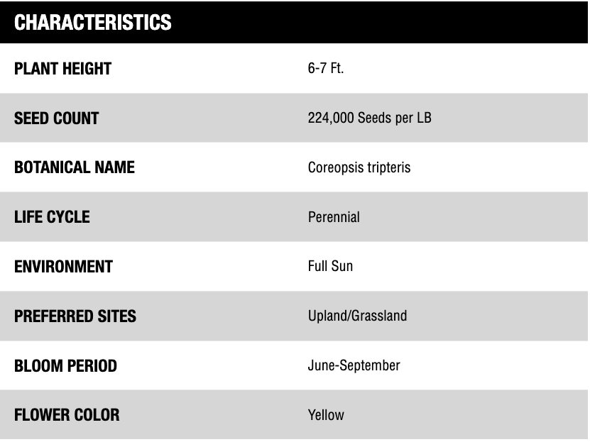 COMMENTS: This is the tallest Coreopsis, which blooms later than other members of the genus. It also has smaller flowers with dark brown centers, rather than the yellow centers of other species. Tall Coreopsis is more impressive when it occurs in colonies rather than as a stand-alone specimen.
