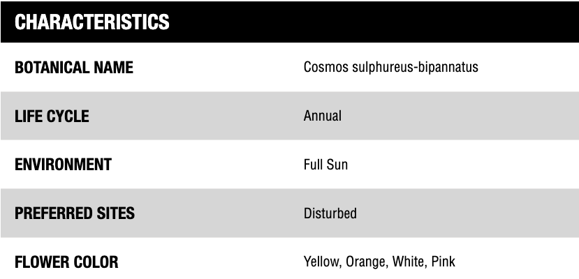 Cosmos are annual plants that are known for their beautiful flowers that bloom throughout the growing season from May-October. Different subspecies of cosmos range the colors of these blooms from orange/yellow/red with C. sulphureus and white/pink with C. bipinnatus. Easily established, shallow spring plantings will give way to 2-4 foot tall plants when grown in full sun, which it prefers. Known to be extremely drought tolerant, compared to other annuals, they do well across the entire United States.