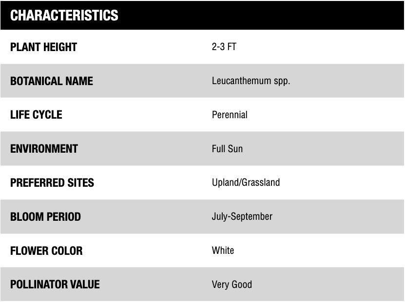 Shasta Daisy is a perennial that can get up to 3 feet tall. Blooming with white flowers in July-September, it usually doesn't flower until the second spring. It needs well drained soil and full sun to light shade. By having light shade there will be double the flowers.