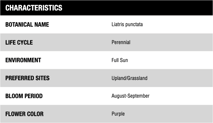 Dotted gayfeather is native to the central United States and Canada where its rapid taproot development digs deep into the upland prairie it inhabits. This perennial grows 1-2 feet in height and is topped with bright purple flowers that slowly open from the top down, allowing it to stay in bloom for long periods of time from August-September. Found growing in dry soils, it prefers full sun but is tolerant of shade as well.