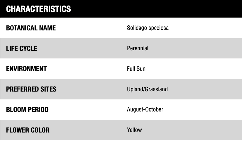 Showy goldenrod is a native perennial found throughout the eastern half of the United States in mesic to dry upland prairies and open woodlands where it can receive full sun to light shade. As its name implies, the inflorescence is a very showy panicle that produces numerous bright yellow flowers when in bloom from August-October. As with most goldenrods, this species also spreads through seeds and rhizomatous roots allowing it to form dense colonies, especially in disturbed soils. It is an important nectar source for late season butterflies, bees and other insects. Shallow seeding into a firm seed bed in late fall or early spring should produce a good stand.