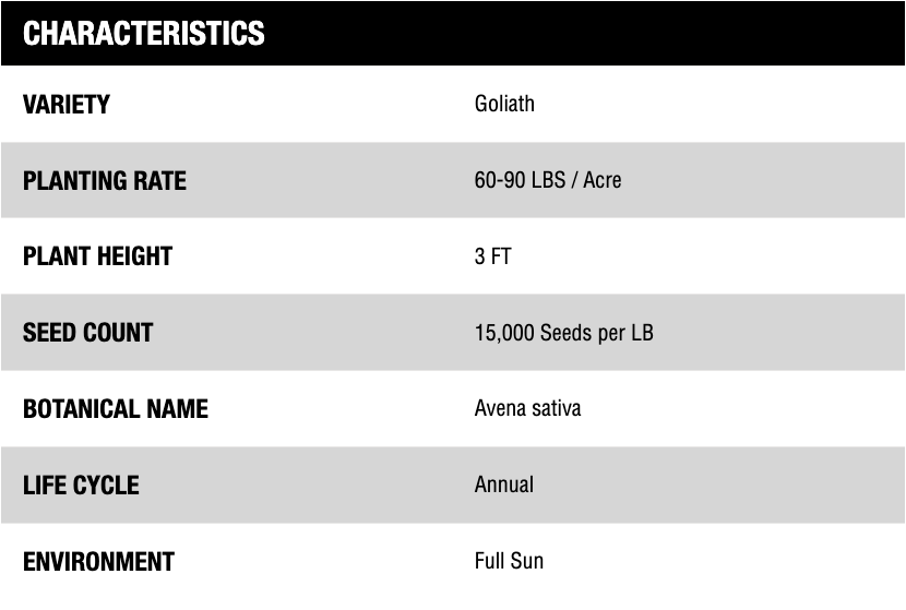 Goliath Oats is a late maturing, multipurpose oat that can be used for grain, forage, or straw. This particular oat variety is tall with very good straw strength, medium high protein, and good test weight. Goliath Oats are very high yielding with excellent feed value as well as an excellent disease resistance package.
