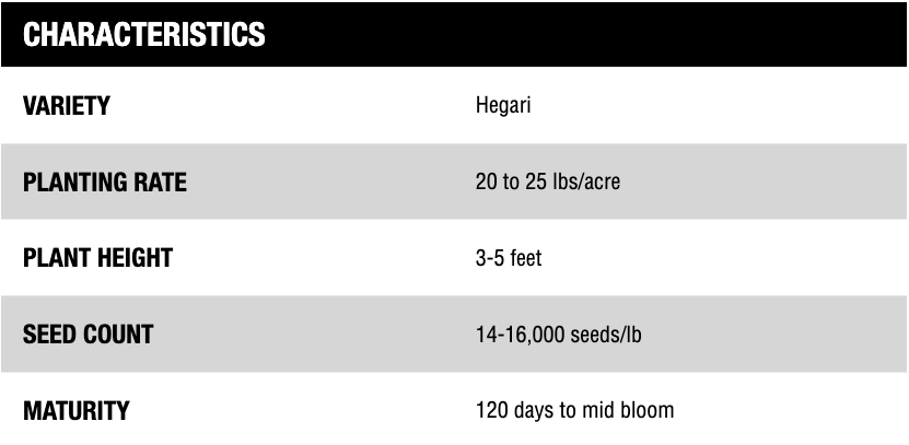 Hegari is a short growing forage sorghum that is an original landrace from Africa brought to the United States prior to the Civil War. The specific strain used as the parent material for the hegari used today was selected in 1908. Compared to other landraces, it has more palatable stems and forage and the seeds are less bitter due to low tannin content. It is distinctly inferior in both yield and quality to modern BMR hybrids.