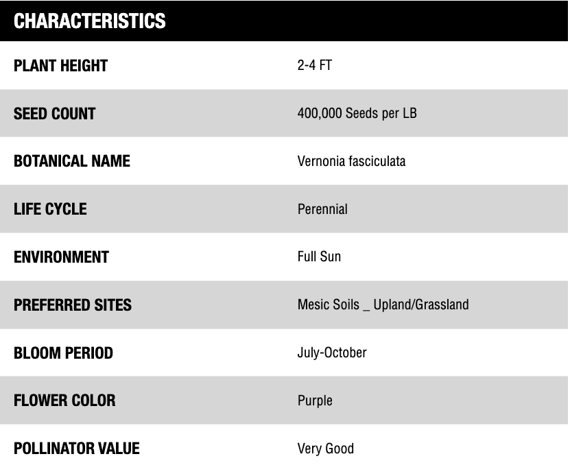 Ironweed is commonly seen distributed across the central United States in grasslands and areas of moist soils. This tough and bitter prairie plant is not grazed by livestock or wildlife but does offer nectar for pollinators.