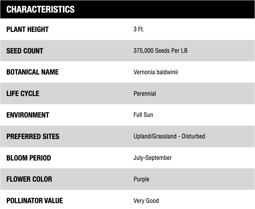 The deep purple flowers of Baldwin’s ironweed can be seen blooming across pastures and grassland of central United State from July-September. This perennial, growing between 2-4 feet in height, prefers full sunlight and moist ground, but will do well in many different grassland conditions. Not eaten by cattle due to its bitter taste, this plant will increase in overgrazed pastures.