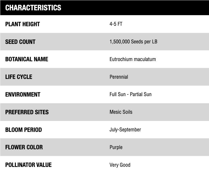 Spotted Joe Pye Weed, perennial, inhabits wet soils of marshes, swamps, ditches and wet meadows. Found widespread through much of the United States, it prefers to grow in moist, fertile soils with full sun to shade where it can reach heights of 7 feet. The name comes from the purple spots that are present on the stems. The large bright inflorescences are in bloom from July-September and are an important nectar producer for migrating butterflies and other insects.