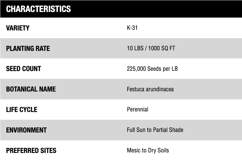 K-31 Tall Fescue is a wide bladed and light colored tall fescue compared to today’s improved turf type tall fescues. This introduced, cool season grass does possess superior heat and drought tolerance and is highly adaptable in much of the United States.
