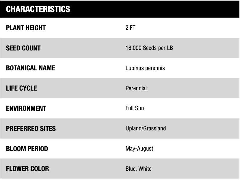 Perennial lupine, also known as sundial, is a perennial legume that is known as the only food source for the Karner Blue Butterfly larvae. This deep rooted plant can tolerate poor sandy soils and prefers full sun where it grows to a height of 2 feet. Found in the southern states and the northeastern parts of North America. It blooms from May-August with a range of colors from blue to white.