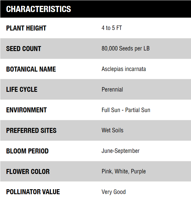 Swamp Milkweed is widely distributed across the United States where it inhabits wet meadows, swamps marshes, pond edges and stream banks. Although it does best in moist soil conditions, it will grow in drier soils such as upland prairies, field edges and ditches. This long-lived perennial prefers to grow in full sunlight and can reach 3-5 feet in height during its second year of growth. Blooming from June-September, the flowers can be pink, purple, or even white. The globe shaped inflorescences attract many hummingbirds, bees and butterflies who seek the nectar from the flowers. All parts of the plant are toxic to livestock and humans, although many Native American tribes ingested it for medicinal uses. If the plant is broken, such as having a leaf removed, it produces a milky white sap from the wound, although not as much as some of its relatives.