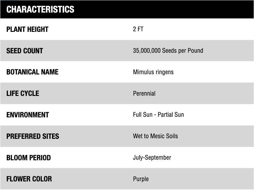 Monkey flower, a perennial, has been documented growing in most of the lower 48 of the United States and in Canada. Growing 1-3 feet in height, it grows best in moist to wet soil conditions in full sun but does well in partial shade. The purple flowers, which resemble a monkey face, can be seen in July-September.