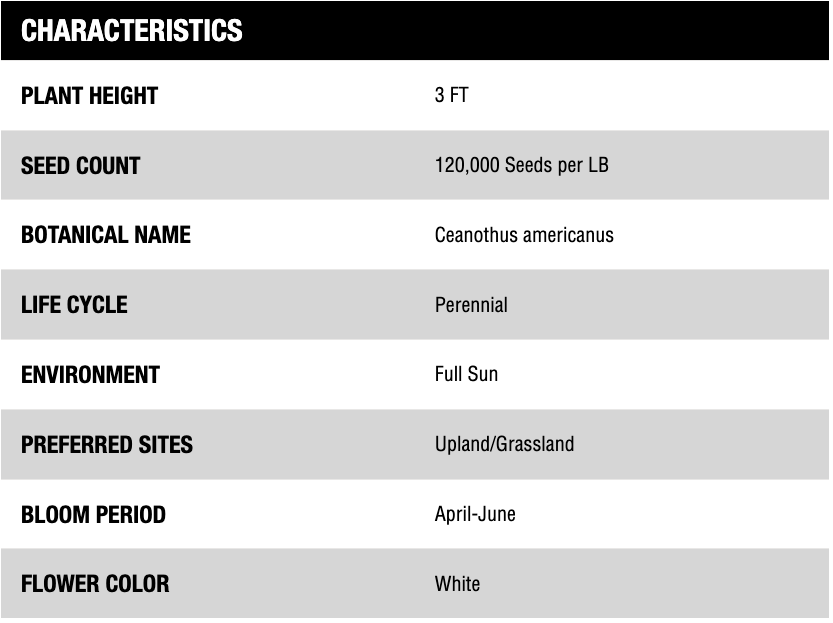 This perennial shrub can be found growing in sandy soils of open prairies and woodlands from central to eastern North America. Reaching 3 feet in height, it grows well in full to partial sun and tolerates drought condition quite well due to its deep taproot that can reach to 15 feet. Small white flowers bloom in clusters from April-June and are frequented by small pollinators.