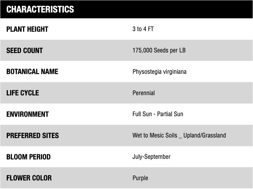 Obedient plant is a perennial forb found distributed across the central to eastern half of the United States and Canada. It inhabits moist to mesic soil prairies, thickets, woodland edges and clearings where it enjoys full to partial sunlight. Growing from 2-4 feet in height, it produces showy purple flowers from July-September and is utilized by many insects and hummingbirds as a nectar source. The “obedient” flowers will remain in position if moved.
