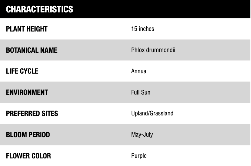 A short growing annual found primarily in the southern parts of the United States, phlox can be seen in abundance growing along the roadsides in early spring. Rarely growing over 18” in height, it prefers full sun and sandy soils, although it can grow in a wide range of soil types. This wildflower likes to grow in short grass meadows where it blooms early in the year, May-June. Phlox many different flowering colors of red, white, purple, and pink, make it a favorite in cultivated gardens and landscapes. Fall, shallow seeding is recommended at a rate of 8-10 pounds to the acre for a full stand.