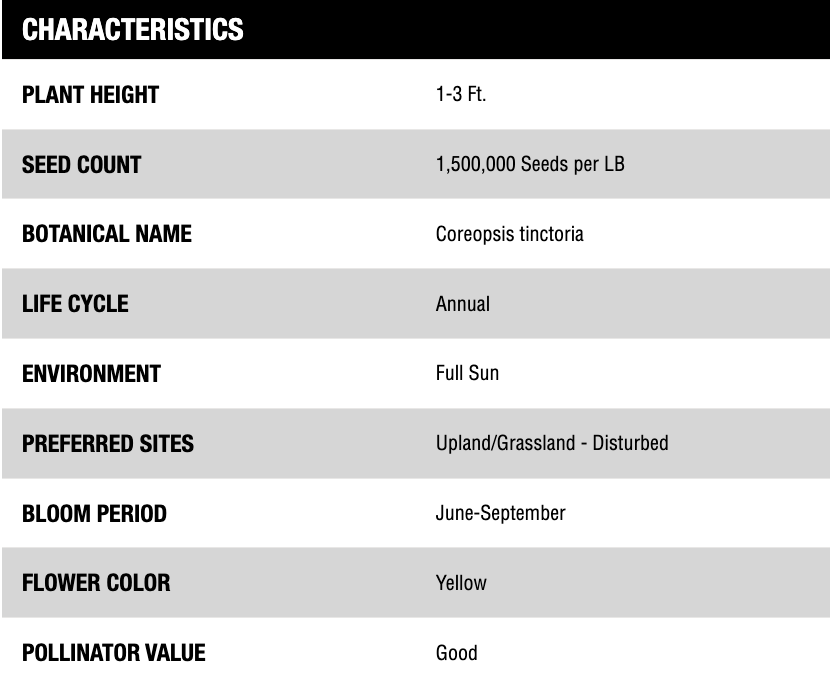 Plains Coreopsis is a hardy annual native wildflower found in much of the United States. This fast growing wildflower produces many yellow flowers with maroon centers.
