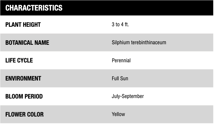 A long lived perennial member of the Asteraceae family, prairie dock is found in the eastern United States. Large basal leaves that are very gritty in texture give way to a tall, 4-10 feet, slender flowering stalk in the late summer. The bright yellow flowers, present from July-September, attract numerous pollinating species and the seeds are consumed by small birds. It prefers full sun and well drained loamy soils, although with its deep tap root it can withstand gritty soils and drought conditions.