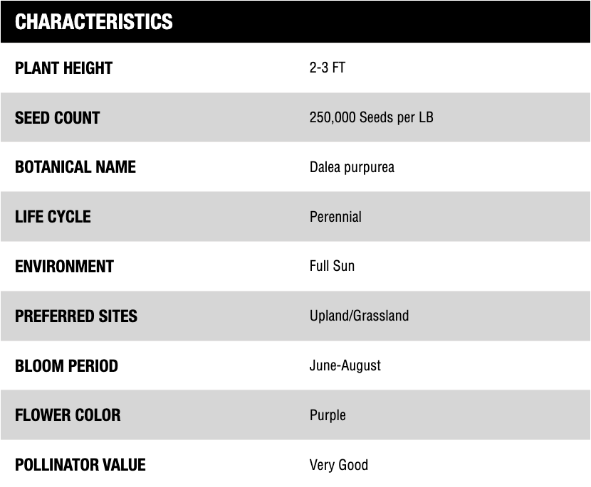 Purple Prairie Clover is a widely distributed shorter stature legume native forb in the United States. This native wildflower is an important food source for pollinators and valued component in many diverse ecosystems.