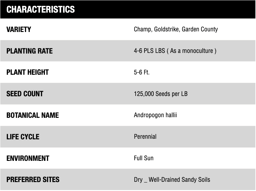 CHAMP is a hybridized mix between multiple species of big bluestem and sand bluestem from the fine soil areas of eastern and northern Nebraska. Utilized in solid stands or mixtures for conservation or forage in sandy, fine textured soils, especially in the eastern 2/3 of Nebraska.