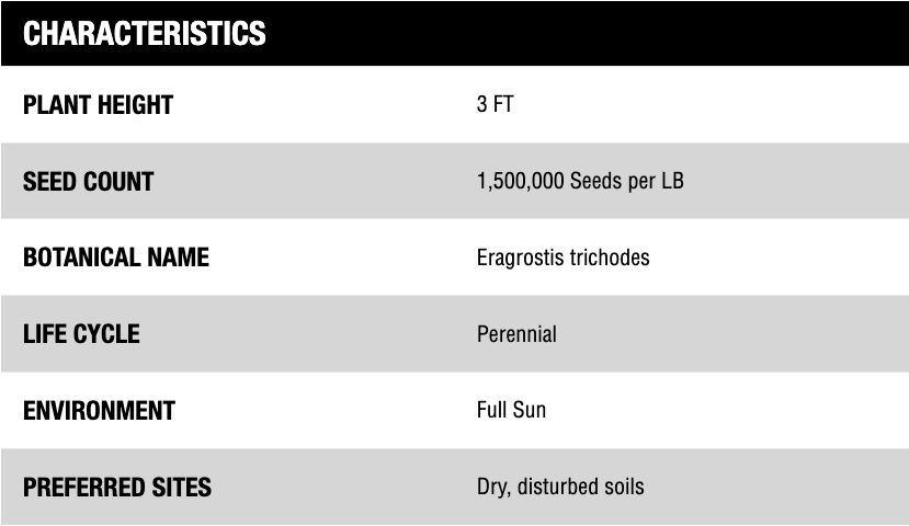 AREA OF ADAPTATION: The plants normally grow from 30 to 48 in high and produce a heavy root system, making the species of considerable value in soil and water conservation. Contrary to Weeping Lovegrass, the leaves, though mostly basal, are comparatively wide and tender.