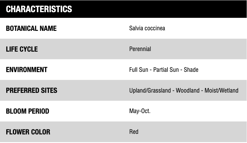 The only native sage that has red flowers, scarlet sage can be found naturally in the southern United States where it can reseed itself. It can be grown in northern climates but may need to be treated as an annual due to winter kill. Tolerating many different soil types and moisture levels, it grows well in both sun and shade, although flowering may be affected in shade. Growing from 1-3 feet in height and producing showy red flowers during its long bloom period, May-October, it is highly utilized by pollinators, butterflies and hummingbirds. Deer do not like to graze on this species of sage due to its strong smelling foliage.