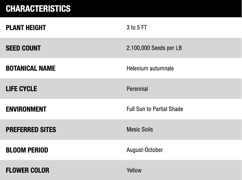 A tall, 3-5 feet, perennial member of the Asteraceae family, Sneezeweed can be found across the United States. It prefers full sun and moist soils such as those along open streams, ponds and wet meadows. The name comes from the process that when dry, it can be crushed down to a snuff to induce sneezing. Its bright yellow blooms are noticed from August-October and can be promoted to continue flowereing by removing spent flowers. Its long, showy blooming period makes it a great plant for pollinators and landscaping gardens. The plant can be cut back prior to blooming (5-6 weeks) to increase branching and inhibit falling over.