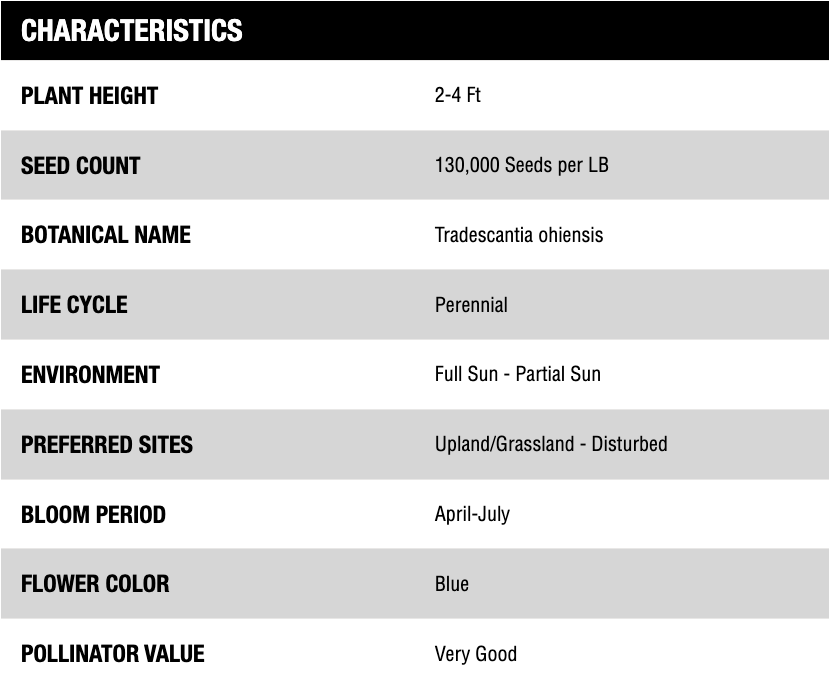 Ohio Spiderwort is an herbaceous perennial member of the dayflower family that grows from 2-4 feet tall. It can be found growing in the eastern half of the United States in road ditches and medium open prairies and meadows. It grows best with full to partial sun and can tolerate a wide variety of soil types and moisture levels. The blue flowers can be seen from April-July in the mornings before they close in the late afternoon and evening. Ohio spiderwort can be grown from seed with a fall planting or an early spring planting with stratified seed. Garden and landscape plantings are common due to the pretty flowers that bloom for an extended period.