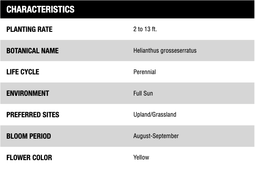 Given its name by the serrated edges of its narrow leaves, it is not a distinguishing characteristic due to variability as some leaves are smooth or only slightly serrated. Its smooth red stems aid in the identification of this Helianthus member. Growing best in full sunlight and moist, fertile soils, it can reach 2-13 feet in height. Bright yellow flowers are in bloom from August-September.