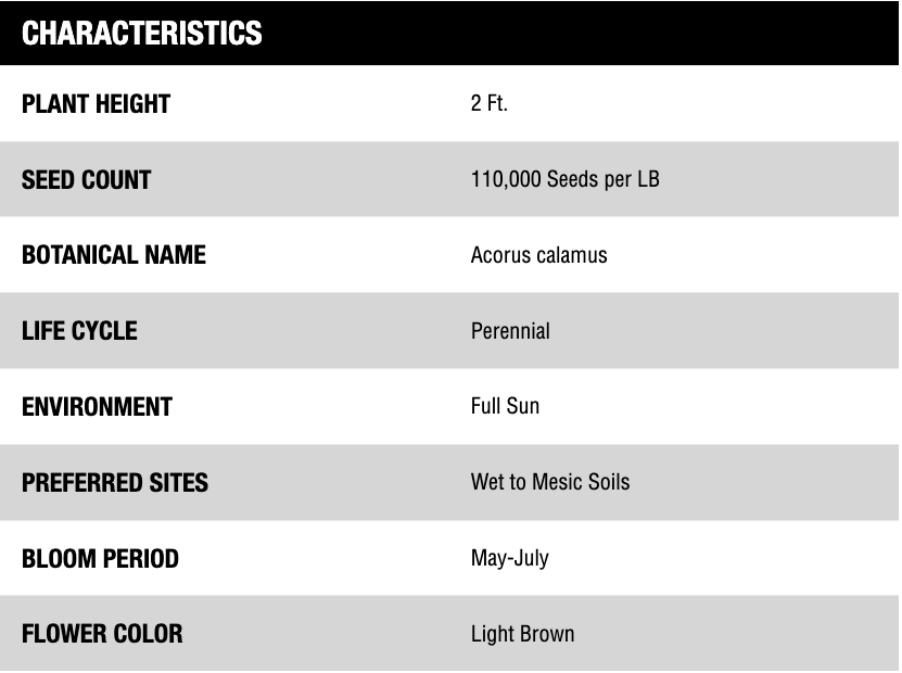 Management: Keep soil very moist to saturated; sweet flag does not tolerate droughty conditions. It grows well under seasonal, shallow inundation, however, avoids flooding of newly established plants or seeded areas. Starter fertilizers may be used indoors to improve early growth but are unnecessary once transplanted outdoors into a rich soil. The spadix will turn brown as the seed ripens in late summer or early fall. Seed can be planted immediately or stored in low humidity refrigeration.