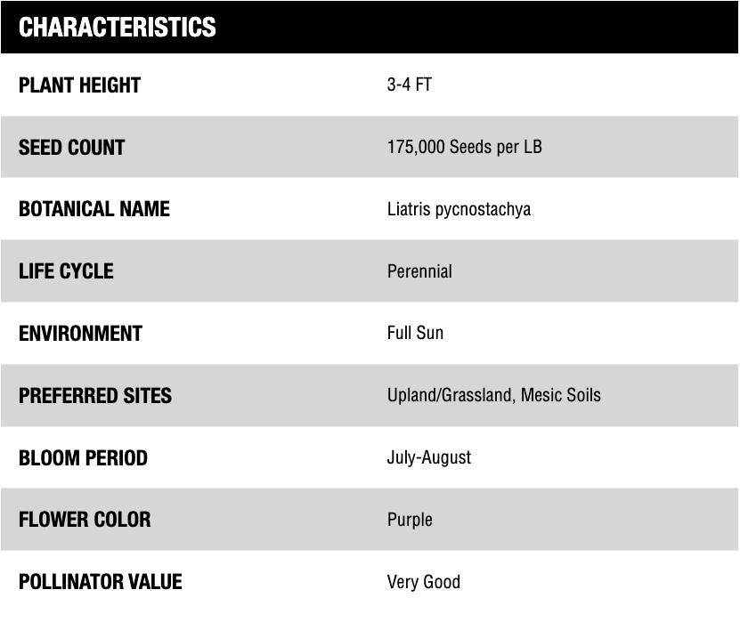 Thickspike Gayfeather, also known as Kansas gayfeather, is a tall, hardy native perennial of the Asteraceae family. The purple inflorescence are long and bloom from the top down to extend the overall period that the plant is flowering during its July-August bloom period. Growth occurs best in moist, low laying areas of tall grass prairies. Seeding should be done in fall or late winter into a clean firm seed bed. Planting depth of a ¼ inch is best and caution should be taken to not plant any deeper.