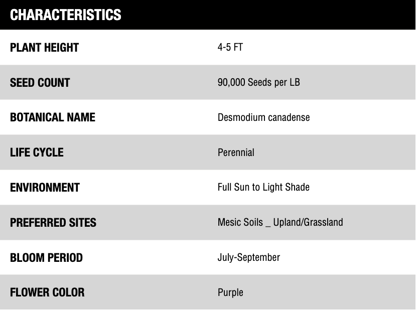 Uses: Showy ticktrefoil is used for wildlife food and cover and as a small component in seeding mixtures for prairie restoration. Description: Showy tick trefoil is a tall native, perennial warm-season legume. Adaptation and Distribution: Showy tick trefoil occurs in prairies and wet meadows, along spring branches, and in open thickets. Establishment: Prepare a clean weed free seedbed by disking and harrowing. Firm the seedbed by cultipacking. The seedbed should be firm enough to allow the seed to be planted ¼ inch deep. Seeding rates for showy ticktrefoil should be about 3 to 4 pounds pure live seed per acre for wildlife planting. Management: Reduce weed competition by mowing at a height that will not affect the ticktrefoil seedlings. For grassy weed control use a grass herbicide and follow label recommendations, as herbicide weed control will encourage a good stand.