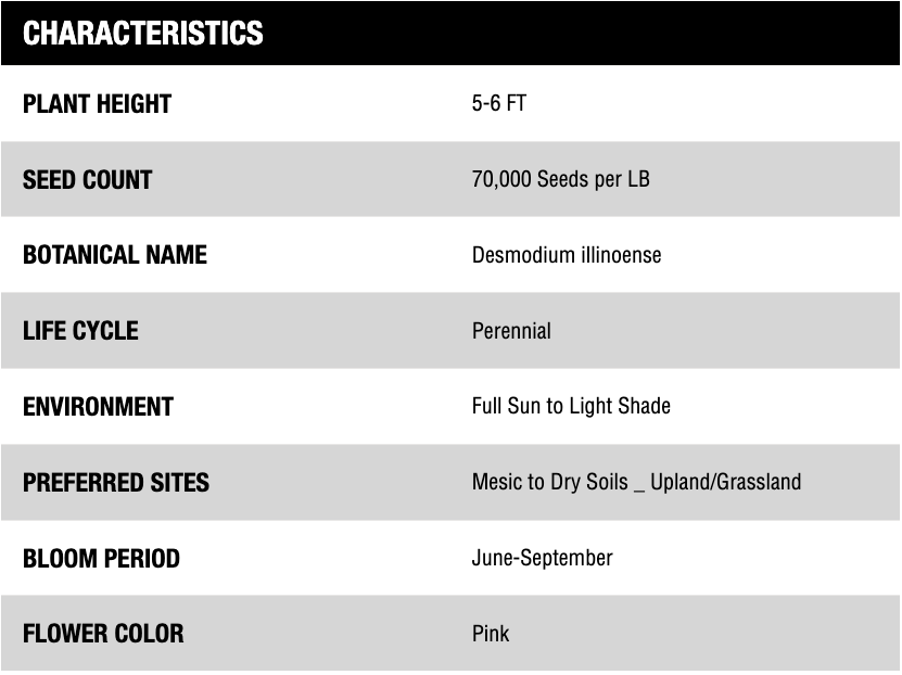 Illinois Tick Trefoil is a member of the bean family that grows from 2-5 feet in height. Distribution lays within the central portion of North America from Texas to the Great Lake region. It does best when growing in full sun and loamy soils in grasslands and shrubby areas where native prairie remnants occur. Blooming in June-September, each plant will stay in bloom up to 3 weeks as only a few of the purple flowers will be in bloom at a time. Flowers are replaced with segmented peapods that are covered in hairs that assist the seed in dispersal by clinging to passing clothing or fur. With the proper rhizobia, Illinois Tick Trefoil will fixate nitrogen into the soil to help with soil fertility.