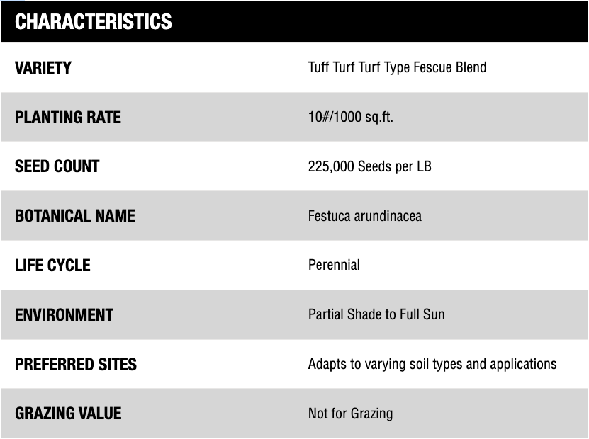 Tuff Turf is a fine leaf fescue with dark green color providing a dense thick turf. Strong, aggressive turf to withstand high traffic use.