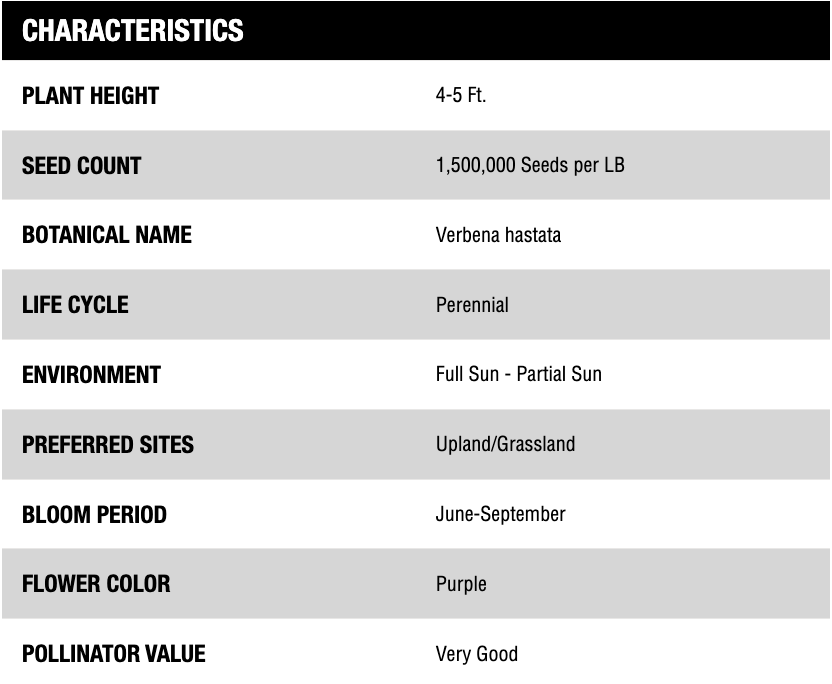 Blue vervain, also known as swamp vervain and simpler's joy, is a native that can be found distributed across most of the contiguous United States. A tall, 2-6 feet, perennial plant that blooms between June and September with multiple purple/blue flowers that open throughout its blooming period. An important plant to pollinators makes it an excellent option for butterfly gardens and landscaping needs. It grows best in full/partial sun and moist soils but grows well across a variety of habitats and soil conditions. Its bitter taste keeps it from being grazed by large mammals and livestock, which allows it to grow well in overgrazed pastures. Maintenance of the plant is simple with it spreading via rhizomes and seeds.