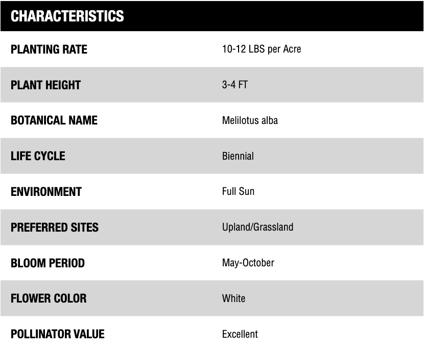 White Blossom Sweet Clover is an introduced clover from Europe but is not found in much of the United States. This biennial legume is an important and highly valued specie used in many aspects of agriculture, honey production and soil stabilization and improvement.