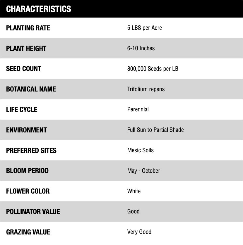 White Ladino Clover is an intermediate height perennial legume introduced from Europe but now naturalized in the United States. Closely related to White Dutch Clover, it is the taller of the two species.