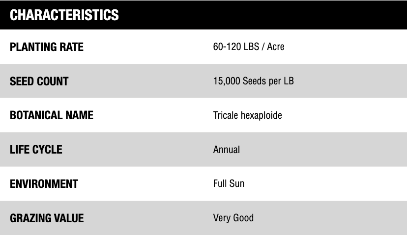 A cross between durum wheat and rye pollen, triticale offers a productive alternative to both of its parents. Not as winterhardy as rye, but similar to wheat varieties in that factor. Triticale offers the high forage or silage yield of rye, with added quality from the wheat component. Many varieties are available, as breeding of triticale has improved recently. Ideal planting for grain production is the same as winter wheat, while late August planting offers more fall growth with better disease resistance than wheat. Planting winter triticale in the spring after vernalization can occur may offer a benefit of added forage production in late spring and summer.